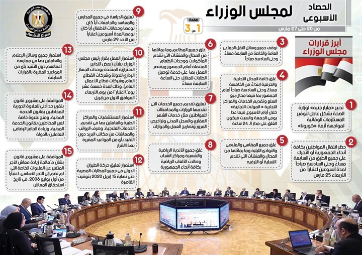 وجاء في الإنفو جراف، أنه تمت الموافقة على عدد من القرارات، تشمل إصدار قرار بتدبير "مليار جنيه" لوزارة الصحة بشكل عاجل لتوفير المستلزمات الوقائية لمواجهة أزمة "كورونا"، فضلاً عن حظر انتقال المواطنين بكافة أنحاء الجمهورية أو التحرك على جميع الطرق من السابعة مساءً وحتى السادسة صباحاً لمدة أسبوعين، اعتباراً من الأربعاء 25 مارس 2020، مع توقف جميع وسائل النقل الجماعي العامة والخاصة من السابعة مساءً وحتى السادسة صباحاً، بجانب غلق كافة المحال التجارية والحرفية ابتداءً من الخامسة مساءً وحتى السادسة صباحاً أمام الجمهور بما فيها محال بيع السلع وتقديم الخدمات والمراكز التجارية "المولات التجارية" خلال أيام الأسبوع فيما عدا يومي الجمعة والسبت فيكون الغلق على مدار الـ 24 ساعة.
