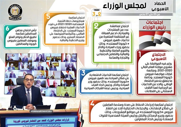 نشر المركز الإعلامي لمجلس الوزراء، إنفو جرافاً سلط من خلاله الضوء على الحصاد الأسبوعي لمجلس الوزراء، وذلك خلال الفترة من 20 حتى 27 مارس 2020، والذي تضمن الموافقة على عدد من القرارات، فضلاً عن الاجتماعات التي عقدها الدكتور مصطفى مدبولي، رئيس مجلس الوزراء، هذا بجانب ما قام به سيادته من أنشطة.