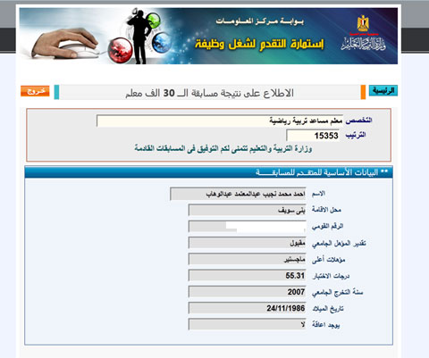 أكد عدد من المتقدمين لمسابقة الـ"30 الف معلم" أنه اثناء قيامهم بالبحث عن ترتيبهم في مسابقة علي موقع وزارة التربية والتعليم تلقوا رسالة علي الموقع "وزارة التربية والتعليم تتمنى لكم التوفيق فى المسابقات القادمة".