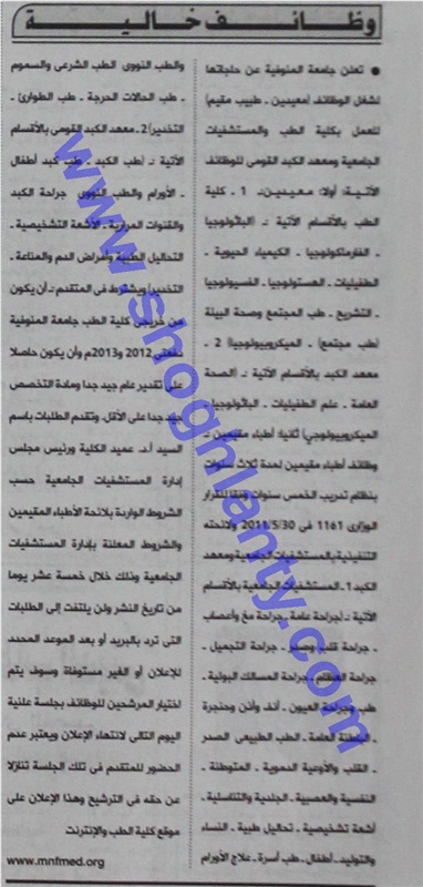 جامعة المنوفية تعلن عن حاجتها لاعضاء هئية تدريس جدد ..ننشر التفاصيل