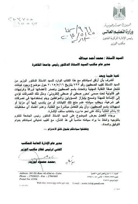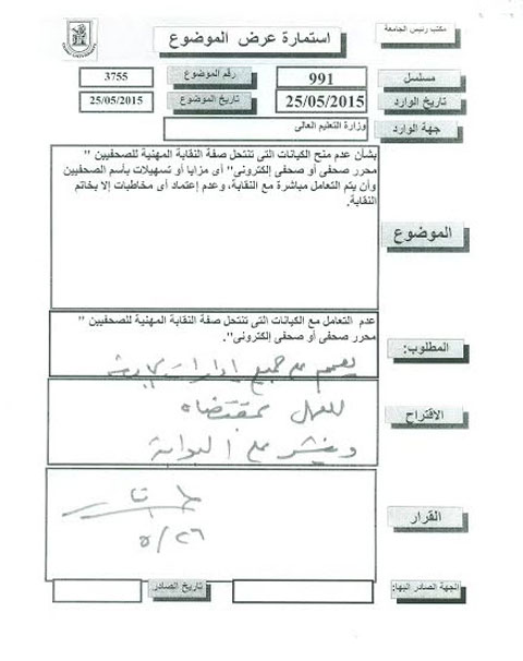 و كان نص الخطاب المرسل من نقابة الصحفيين ألي وزارة التعليم العالي التالي:
