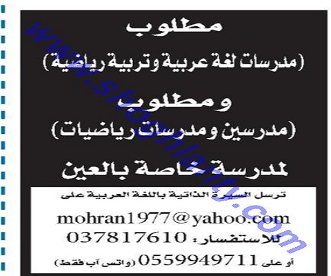 تعلن مدرسة خاصة بالعين بدولة الإمارات عن حاجتها إلي مدرسات لغة عربية وتربية رياضية.