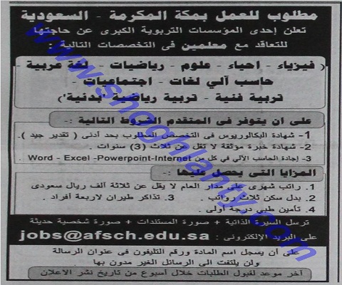 تعلن إحدي المؤسسات التربوية الكبري في مكة المكرمة عن حاجتها الي معلمين في التخصصات التالية(فيزياء – احياء – علوم – رياضيات – لغة عربية – حاسب الي لغات – اجتماعيات – تربية فنية – تربية رياضية).