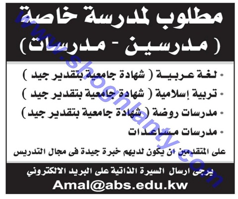 تعلن مدرسة خاصة في الكويت عن حاجتها لمدرسين ومدرسات في اللغة العربية (شهادة جامعية بتقدير جيد) وتربية إسلامية (شهادة جامعية بتقدير جيد) ومدرسات روضة (شهادة جامعية بتقدير جيد) ومدرسات مساعدات علي المتقدمين ان يكون لدية خبرة جيدة في مجال التدريس.