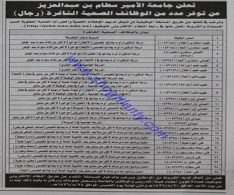 تعلن جامعة الأمير سطام عبد العزيز عن توفر عدد من الوظائف الصحية الشاغرة (رجال) وترغب في شغلها عن طريق المسابقة الوظيفية لمن تتوفر لديهم المؤهلات العلمية والخبرات المطلوبة حسب المسمسات الشروط في رابط النظام الإلكتروني للتوظيف(HTTP://JOBS.SAU.EDU.SA) والوظائف المطلوبة هي كالتالي: