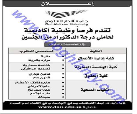 تعلن جامعة دار العلوم السعودية عن تقديم فرصا وظيفية أكاديمي لحاملي درجة الدكتوراه من الجنسين في التخصصات التالية: