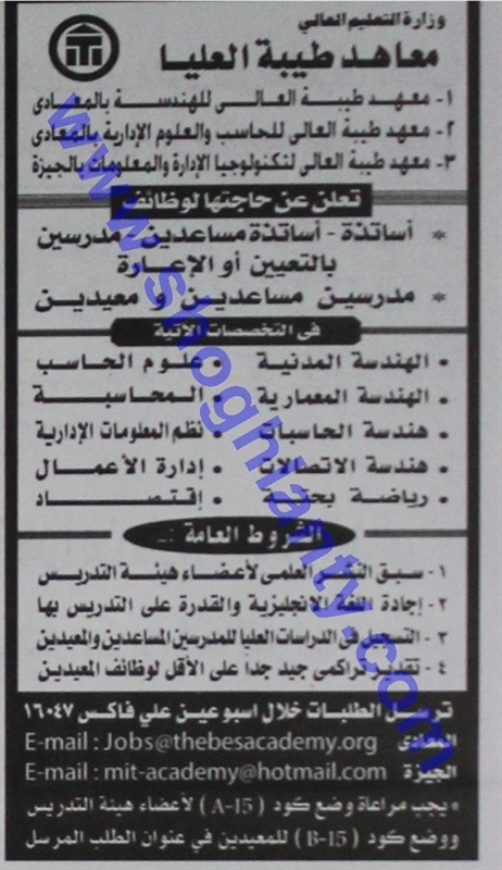 تعلن معاهد طيبة العليا - مصر,معهد طيبة العالى للهندسة بالمعادى - مصر, معهد طيبة العالى للحاسب والعلوم الادارية بالمعادى - مصر, معهد طيبة العالى لتكنولوجيا الادارة والمعلومات بالجيزة – مصر عن حاتها لأساتذة وأساتذة مساعدين – مدرسين بالتعين أو الإعارة في التخصصات التالية:-