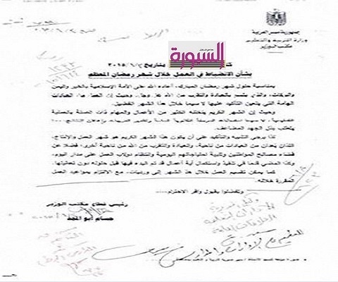 ارسلت التعليم كتابا دوريا للمديريات وذالك للموازنة بين العمل والنواحي الدينية بمناسبة شهر رمضان هذا الكتاب الدوري يتيح تقسيم قوة العمل بالمدارس الي ورديات خلال هذا الشهر الكريم .
