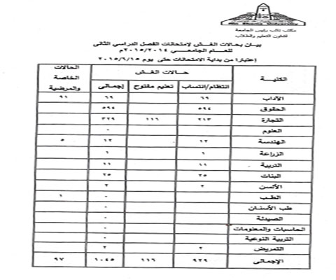 أصدرت جامعة حلوان بيانا بحالات الغش بامتحانات الفصل الدراسي الثاني حيث احتلت كلية الحقوق المركز الاول بعدد594 حالة غش وفيما يلي بيان بعدد الحالات الخاصة بكل كلية: