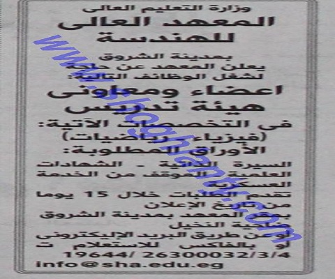 يعلن المعهد العالي للهندسة بمدينة الشروق عن حاجة لشغل الوظائف التالية :