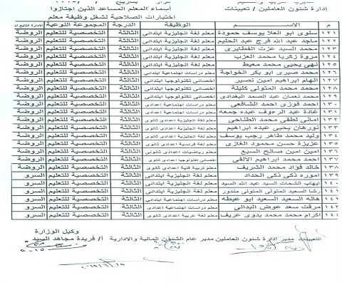 وجاء في القرار أن تتخذ اجراءات التعيين للمعلم المساعد وما في مستواها والذين حصلوا علي شهادة الصلاحية واستوفوا كافة الشروط المطلوبة علي وظيفة معلم أو ما يعادلها وفقا للمادة 73 من القانون رقم 155 لسنة 2007 والمعدل بالقانون 93 لسنة 2012 علي الوظائف الموضحة لكل منهم وعددهم 159