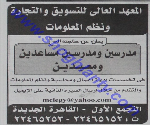 يعلن المعهد العالي للتسويق والتجارة ونظم المعلومات بالقاهرة الجديدة- التجمع الاول عن حاجتة إلي مدرسين ومدرسات ومعيدينفي التخصصات التالية: