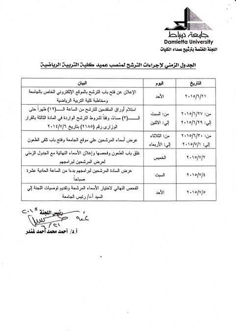 تعلن اللجنة المختصة بترشيح عمداء الكليات عن فتح باب الترشح لمنصب "عميد كلية التربية الرياضية"، و الجدول الزمني لإجراءات الترشح للمنصب ذاته، وذلك على النحو التالى: