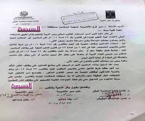 في اطار تنفيذ الفتوي السيد المستشار القانوني لوزير التربية و التعليم بشأن تطبيق اشتراطات الترقي لأعضاء هيئة التعليم الواردة في القانون 93 لسنة 2012م علي المعلمين غير المؤهلين تربويا و الذين يحملون مؤهلات متوسطة و فوق متوسطة بعرض الآتي :