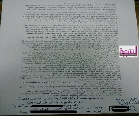 وخاطب أعضاء هيئة التدريس رئيس الجمهورية من خلال تلغراف النقابة وتوقيع مئات من أعضاء هيئة التدريس على مطالب تضمن إصلاح أوضاع الجامعات وكذلك الوضع المالى وزيادة رواتبهم