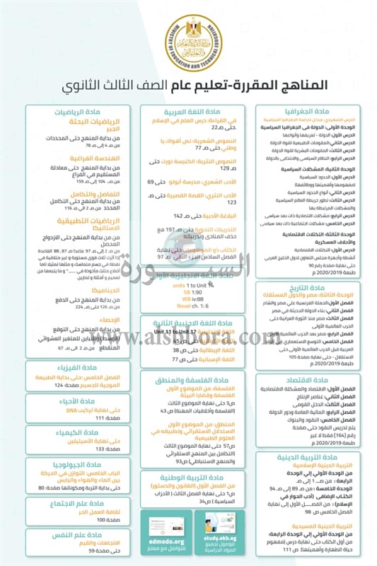 أعلن الدكتور طارق شوقي وزير التربية والتعليم، عن المناهج المقررة على الصف الثالث الثانوي في الفصل الدراسي الثاني حتى ١٥ مارس ٢٠٢٠
