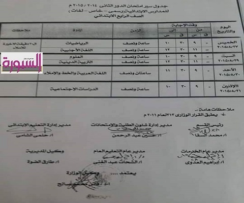 " السبورة " تنشر جدول امتحانات الدور الثانى عام 2015 للصفين الثالث و الرابع الابتدائي والتي تم تأجيلها الي شهر اغسطس وتبدأ 27 اغسطس 2015