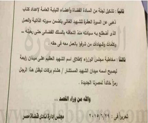 أعلن سكرتير نادي القضاة منذ قليل علي موافقة مجلس الوزراء علي الطلب الذي قدمة نادي القضاة في بيانة باطلاق اسم الشهيد المستشار هشام بركات علي ميدان رابعة العدوية وذالك تكريما لة وتخليدا لذكراة