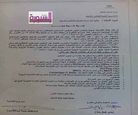 وعليه يرجى التكرم بالتنبية على الادارات التعليمية بتجميع ملفات المعلمين /الاخصائين ومراجعة بيانا هم والتاكد من استيفاء كافة الشروط