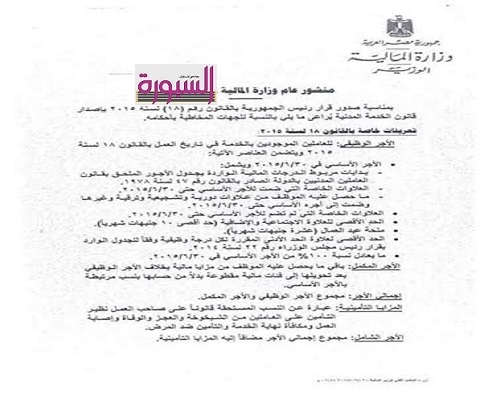 كشفت وزارة المالية عن طريقة صرف المرتبات للمخاطبين بقانون الخدمة المدنية رقم 18-2015 و النماذج الاسترشادية لطريقة احتساب الرواتب فى اجتماع وزارة المالية اليوم 4/7/2015 و اوضح المنشور صرف حافز تعويضي حال انخفض صافي الاجر عن ما تقاضاه الموظف قبل 30/6/2015 .