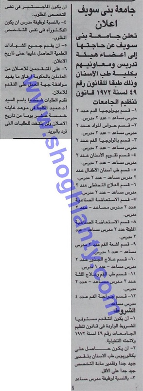 تعلن جامعة بني سويف عن حاجتها إلي أعضاء هيئة تدريس ومعاونيهم وذلك طبقا للقانون رقم 49 لسنة 1972 لتنظيم الجامعات.