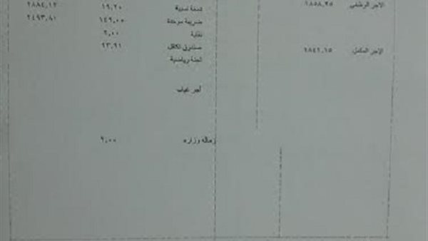 وتضمنت كارتة المرتب الاجر الوظيفى (1858.25) والاجر المكمل (1841.15 ) والاجر الوظيفى عبارة عن( الاجر الاساسى ×2+ العلاوات الخمس +20جنية علاوة اجتماعية وعيد العمال + علاوة اللحد الادنى المقامل للدرجة