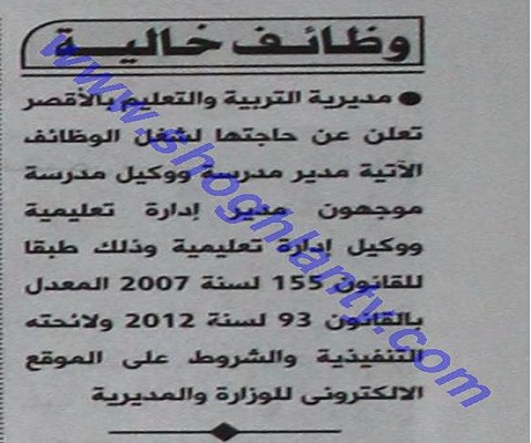تعلن مديرية التربية والتعليم بالأقصر عن حاجتها لشغل الوظائف التالية :
