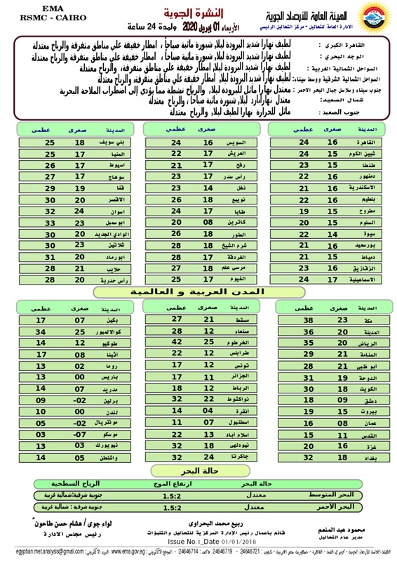 وقال الخبراء، إن السواحل الشمالية الشرقية ووسط سيناء، تشهد طقس طقس لطيف شديد البرودة ليلا، وأمطار خفيفة على مناطق متفرقة والرياح معتدلة، وفى جنوب سيناء وسلاسل جبال البحر الأحمر، طقس معتدل نهارا مائل للبرودة ليلا، والرياح نشطة مما يؤدى لاضطراب الملاحة البحرية، وشمال الصعيد طقس معتدل نهارا شديد البرودة ليلا وشبورة مائية صباحا والرياح معتدلة ، ويشهد جنوب الصعيد طقس مائل للحرارة نهارا لطيف ليلا، والرياح معتدلة .