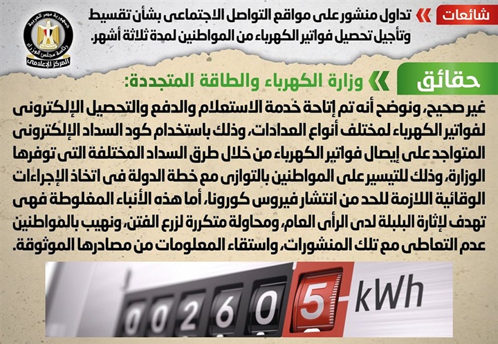 تداولت صفحات التواصل الاجتماعي أنباء بشأن تقسيط وتأجيل تحصيل فواتير الكهرباء من المواطنين لمدة ثلاثة أشهر بسبب انتشار فيروس كورونا، وقد قام المركز الإعلامي لمجلس الوزراء بالتواصل مع وزارة الكهرباء والطاقة المتجددة، والتي نفت تلك الأنباء، مُؤكدةً أنها لم تصدر أي قرارات أو تصريحات بهذا الشأن، وأن كافة فواتير الكهرباء يتم تحصيلها في مواعيدها المقررة دون تأجيل، مُوضحةً أنه قد تم إتاحة خدمة الاستعلام والدفع والتحصيل الإلكتروني لفواتير الكهرباء لمختلف أنواع العدادات، وذلك باستخدام كود السداد الإلكتروني المتواجد على إيصال فواتير الكهرباء من خلال طرق السداد المختلفة التي توفرها الوزارة، وذلك للتيسير على المواطنين بالتوازي مع خطة الدولة في اتخاذ الإجراءات الوقائية اللازمة للحد من انتشار فيروس كورونا، أما هذه الأنباء المغلوطة فهي تهدف لإثارة البلبلة لدى الرأي العام، ومحاولة متكررة لزرع الفتن، ونهيب بالمواطنين عدم التعاطي مع تلك المنشورات، واستقاء المعلومات من مصادرها الموثوقة.