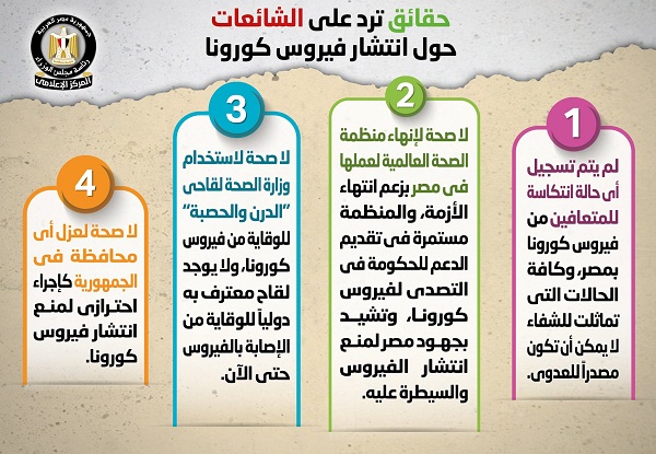 رصد المركز الإعلامى لمجلس الوزراء عددا من الحقائق حول فيروس كورونا، ومنها أنه لم يتم تسجيل أى حالة انتكاسة للمتعافين من الفيروس بمصر، وكافة الحالات التى تماثلت للشفاء لا يمكن أن تكون مصدراً للعدوى، ولا صحة لإنهاء منظمة الصحة العالمية عملها فى مصر بزعم انتهاء الأزمة، مؤكدا أن المنظمة مستمرة فى تقديم الدعم للحكومة فى التصدى لفيروس كورونا، وتشيد بجهود مصر لمنع انتشار الفيروس والسيطرة عليه.