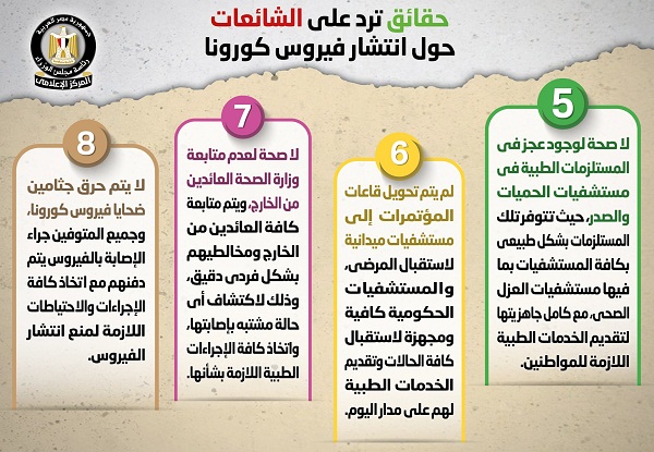 وأكد أنه لم يتم تحويل قاعات المؤتمرات إلى مستشفيات ميدانية لاستقبال المرضى، والمستشفيات الحكومية كافية ومجهزة لاستقبال كافة الحالات وتقديم الخدمات الطبية لهم على مدار اليوم، ولا صحة لعدم متابعة وزارة الصحة العائدين من الخارج، ويتم متابعة كافة العائدين من الخارج ومخالطيهم بشكل فردى دقيق، وذلك لاكتشاف أى حالة مشتبه بإصابتها، واتخاذ كافة الإجراءات الطبية اللازمة بشأنها.