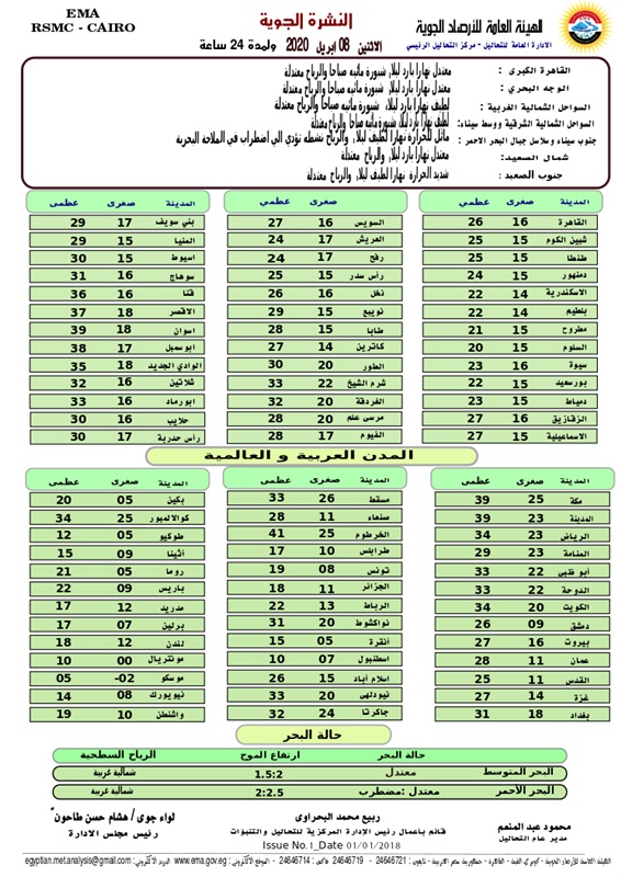 وقال الخبراء، إن السواحل الشمالية الشرقية ووسط سيناء، تشهد طقس طقس لطيف نهارا بارد ليلا، وشبورة مائية صباحا والرياح معتدلة ، وفى جنوب سيناء وسلاسل جبال البحر الأحمر، طقس مائل للحرارة نهارا لطيف ليلا، والرياح نشطة تؤدى لاضطراب فى الملاحة البحرية ، وشمال الصعيد طقس معتدل نهارا بارد ليلا والرياح معتدلة ، ويشهد جنوب الصعيد شديد الحرارة نهارا لطيف ليلا، والرياح معتدلة .
