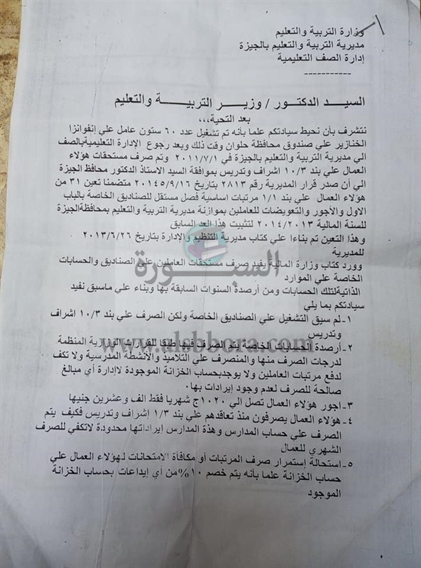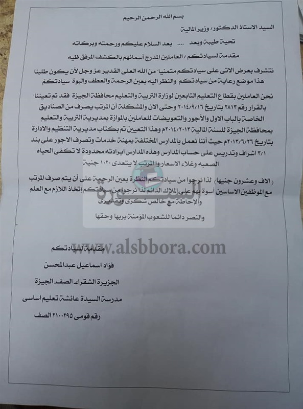 عمال ادارة الصف التعليمية يطالبون وزيرى المالية والتعليم ومحافظ الجيزة بصرف رواتبهم المتأخرة من 5 شهور