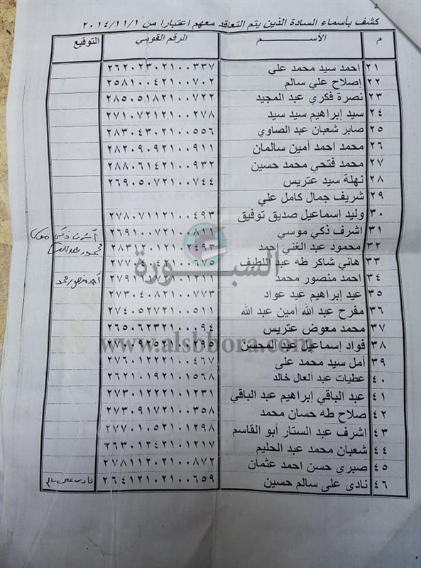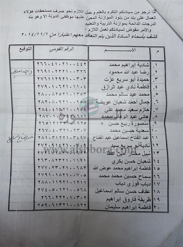 وقال فؤاد اسماعيل، عامل بمدرسة السيدة عائشة بالصف، أنهم كعمال تم التعاقد مهم على بند انفلوانزا الخنازير على صندوق محافظة حلووان قبل ثورة يناير ثم بعد عودة الصف الى محافظة الجيزة تم نقلنا لمديرية تعليم الجيزة وتم صرف مستحقاتنا على بند 3/10 اشراف وتدريس الى ان صدر قرار تعييننا على بند 1/1 مرتبات اساسية فصل مستقل للصناديق الخاصة بالباب الاول والاجور والتعويضات للعاملين بموازنة مديرية تعليم الجيزة للسنة المالية 2013/2014 .