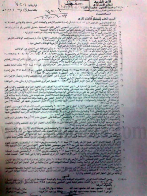 أكد الأمين العام للمجلس الاعلى با لازهر يصدر قرار التثبيت للعمالة المؤقتة بالازهر الشريف التى تم ارجائم من قيل الجهاز المركزى للتنظيم والادارة (7201 ) بتاريخ 23 / 6 / 2015 اعتبارا" من 16 /6/ 2015.