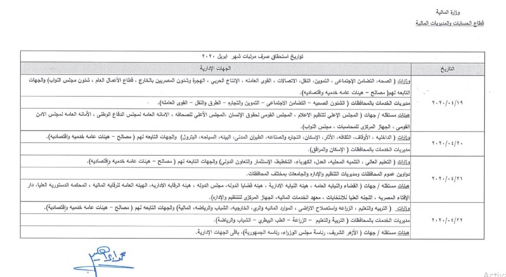 وكان وزير المالية محمد معيط، أصدر قراراً بتقديم مواعيد صرف مرتبات العاملين بكافة الجهات الحكومية لشهر أبريل على أن تبدأ بالتتابع من يوم الأحد الموافق 19 أبريل الجاري حتى يوم 29 من نفس الشهر.