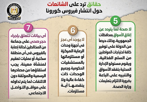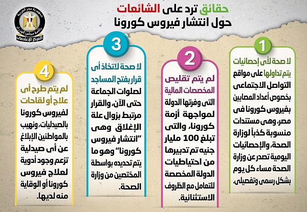 رصد المركز الإعلامى لمجلس الوزراء 7 حقائق حول كورونا ، تضمنت التأكيد على إنه لا صحة لأي إحصائيات يتم تداولها على مواقع التواصل الاجتماعي بخصوص أعداد المصابين بفيروس كورونا في مصر، وهي مستندات منسوبة كذباً لوزارة الصحة، والإحصائيات اليومية تصدر عن وزارة الصحة مساء كل يوم بشكل رسمي وتفصيلي.