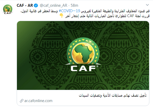 “في ضوء المخاوف المتزايدة والطبيعة المتغيرة لفيروس كورونا وسط الحظر في غالبية الدول، قررت لجنة الطوارئ في "كاف" تأجيل المباريات التالية حتى إشعار آخر”.