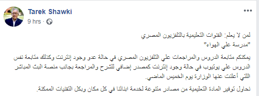 نشر الدكتور طارق شوقي وزير التربية والتعليم والتعليم الفني، حلقة لمادة الدراسات الاجتماعية للصف الأول الإعدادي، وذلك عبر صفحته الشخصية على موقع التواصل الاجتماعي، فيس بوك، قائلآ "لمن لا يعلم: القنوات التعليمية بالتلفزيون المصري".