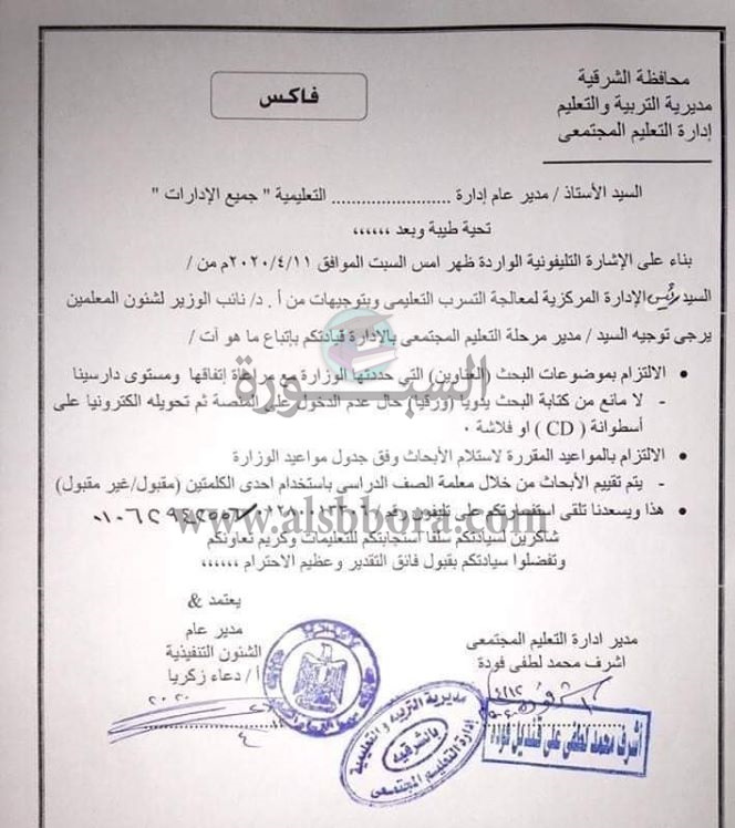 ارسلت مديرية التربية والتعليم بمحافظة الشرقية، فاكسا الى الادارات التعليمية بشأن تقييم المشروعات البحثية للطلاب، انه بناء على الاشارة التليفونية الواردة ظهر امس السبت الموافق 11 ابريل من رئيس الادارة المركزية لمعالجة التسرب التعليمى وبتوجيهات الدكتور رضا حجازى نائب وزير التربية والتعليم لشؤون المعلمين يرجى من مدير مرحلة التعليم المجتمعى بالادارة باتباع التالى: