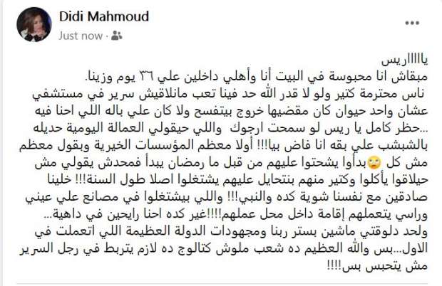 بعد ساعات من السجال بعد تغريدتها علي صفحتها علي موقع التواصل الاجتماعي "فيسبوك"،والتي طالبت فيها بربط الشعب في رجل السرير قائلة أنها شعرت بالغضب من المواطنين الذين ينزلوا من بيوتهم من أجل الفسحة والتسوق سواء بالمولات أو في العتبة وغيرها وليس لأكل عيشهم وقالت:"لا يصح أنى وغيرى نتحبس في بيوتنا علشان في ناس تانية مش ملتزمة تصعب الأمور وتجعلنا نبقى فترة أكثر في المنازل دون أي إحساس بالمسؤولية، ولو كل أناس الملتزمة اللى قاعدين في بيوتهم من شهر وأكثر لا قدر الله تعب وملقاش سرير في مستشفى بسبب الناس غير الملتزمين إيه الى هيحصل!..ودا ميرضيش ربنا".