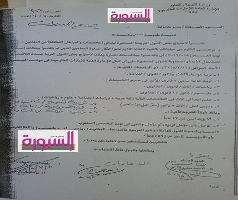 ارسلت الادارة العامة للاعارات الخارجية بوزارة التربية والتعليم منشورا لجميع المديريات التعليمية تعلن عن حاجة بعض الدول العربية لمعلمين وطالبت من يرغب ان يرسل بطاقة الاعارة في موعد اقصاة 26/72015