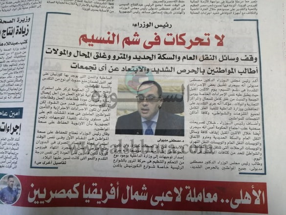 تصريحات رئيس الوزراء تتصدر الصحف المصرية.. إيقاف جميع وسائل النقل العام في شم النسيم وأتوبيسات الرحلات بين المحافظات.. توجيه لوزارة الداخلية والمحافظات للحسم والتحكم في الحركة على الشوارع الرئيسية