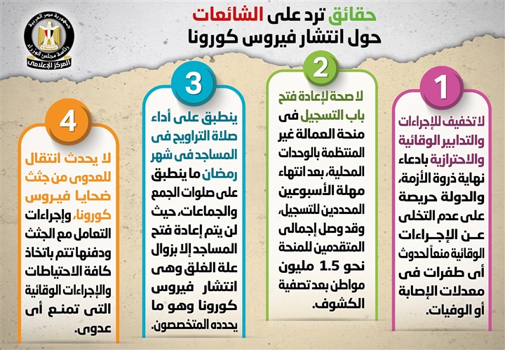 رصد المركز الإعلامى لمجلس الوزراء فى تقريره لرصد الشائعات، 7 حقائق حول فيروس كورونا المستجد، وتضمنت التأكيد على أنه لا تخفيف للإجراءات والتدابير الوقائية والاحترازية بادعاء نهاية ذروة الأزمة، والدولة حريصة على عدم التخلي عن الإجراءات الوقائية منعاً لحدوث أي طفرات في معدلات الإصابة أو الوفيات.