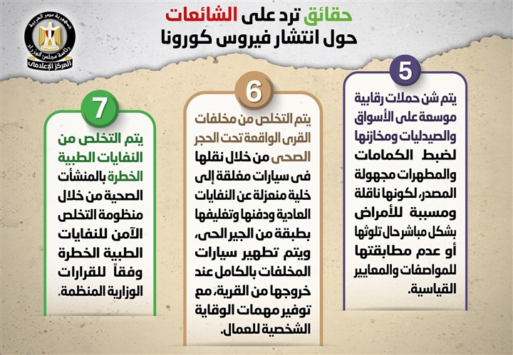 والتأكيد على أنه لا يحدث انتقال للعدوى من جثث ضحايا فيروس كورونا، وإجراءات التعامل مع الجثث ودفنها تتم باتخاذ كافة الاحتياطات والإجراءات الوقائية التي تمنع أي عدوى وانه يتم شن حملات رقابية موسعة على الأسواق والصيدليات ومخازنها لضبط الكمامات والمطهرات مجهولة المصدر، لكونها ناقلة ومسببة للأمراض بشكل مباشر حال تلوثها أو عدم مطابقتها للمواصفات والمعايير القياسية.