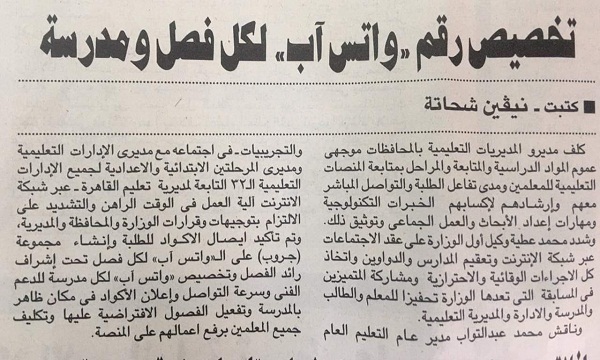 كلف مديرو المديريات التعليمية بالمحافظات موجهى عموم المواد الدراسية والمتابعة والمراحل بمتابعة المنصات التعليمية للمعلمين ومدى تفاعل الطلبة والتواصل المباشر معهم وارشادهم لاكسابهم الخبرات التكنولوجية ومهارات اعداد الابحاث والعمل الجماعى وتوثيق ذلك.