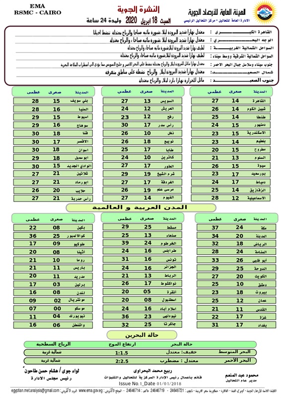 وقال الخبراء، إن السواحل الشمالية الشرقية ووسط سيناء، تشهد طقس لطيف نهارا شديد البرودة ليلا، وشبورة مائية صباحا، والرياح معتدلة، وفى جنوب سيناء وسلاسل جبال البحر الأحمر، طقس معتدل نهارا مائل للبرودة ليلا، والرياح معتدلة تنشط على البحر الأحمر، وخليج السويس مما يؤدى إلى اضطراب الملاحة البحرية، وفى شمال الصعيد طقس معتدل نهارا شديد البرودة ليلا والرياح نشطة على مناطق متفرقة، ويشهد جنوب الصعيد طقس مائل للحرارة نهارا مائل للبرودة ليلا، والرياح معتدلة.