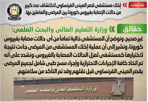 تداولت بعض المواقع الإلكترونية وصفحات التواصل الاجتماعي منشوراً بشأن إخلاء مستشفى قصر العيني الفرنساوي لاكتشاف عدد كبير من حالات الإصابة بفيروس كورونا بين المرضى والعاملين بها، وقد قام المركز الإعلامي لمجلس الوزراء بالتواصل مع وزارة التعليم العالي والبحث العلمي، والتي نفت تلك الأنباء، مُؤكدةً أنه لا صحة لإخلاء مستشفى قصر العيني الفرنساوي لاكتشاف عدد كبير من حالات الاصابة بفيروس كورونا بين المرضى والعاملين بها، مُوضحةً أن المستشفى خالية تماماً من أي حالات مصابة بفيروس كورونا، مُشيرةً إلى أن عملية إخلاء المستشفى من المرضى جاءت نتيجة لاختيارها كمستشفى لعزل الحالات المصابة بالفيروس، مُشددةً على أنه تم اتخاذ كافة الإجراءات الاحترازية وإجراء مسح طبي شامل لجميع المرضى بقصر العيني الفرنساوي قبل نقلهم وقد تم التأكد من سلامتهم.