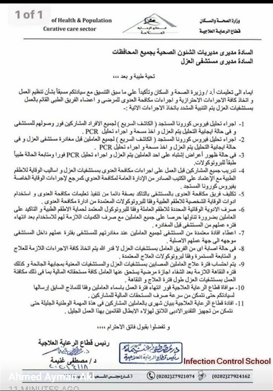 أرسلت وزارة الصحة والسكان منشوراً إلى مديرى مديريات الشئون الصحية بالمحافظات ومديرى مستشفيات العزل ضمن الاجراءات الاحترازية واجراءات مكافحة العدوى للمرضى وأعضاء الفريق الطبى القائم بالعمل بمستشفيات العزل يتم التنبية المشدد على اتخاذ عدد من الإجراءات.