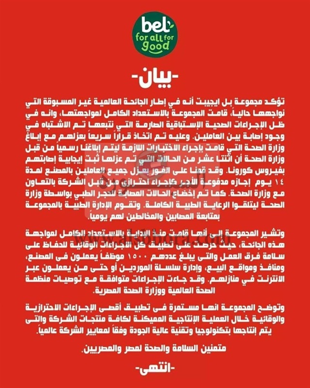 أعلنت مجموعة “بل إيجيبت” – لافاش كيري –، حصيلة الفحصوصات التي جرت لكافة العاملين بها بفرع الشركة في مدينة العاشر من رمضان، بمحافظة الشرقية؛ جراء اكتشاف وجود إصابات بين العمال بفيروس “كورونا” المُستجد.